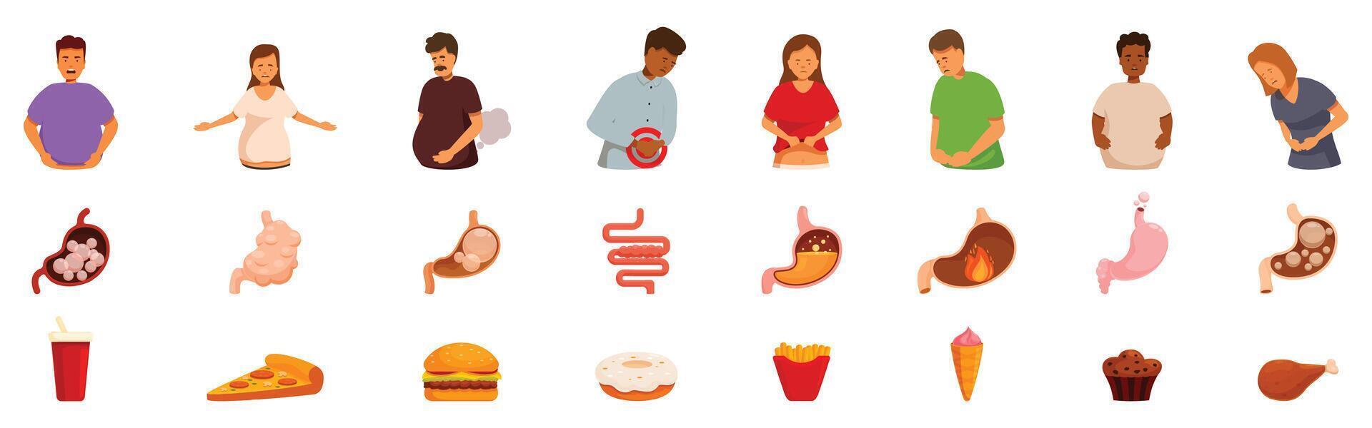 Bloating icons set. Overeating causing stomach ache and digestive problems Pro Vector