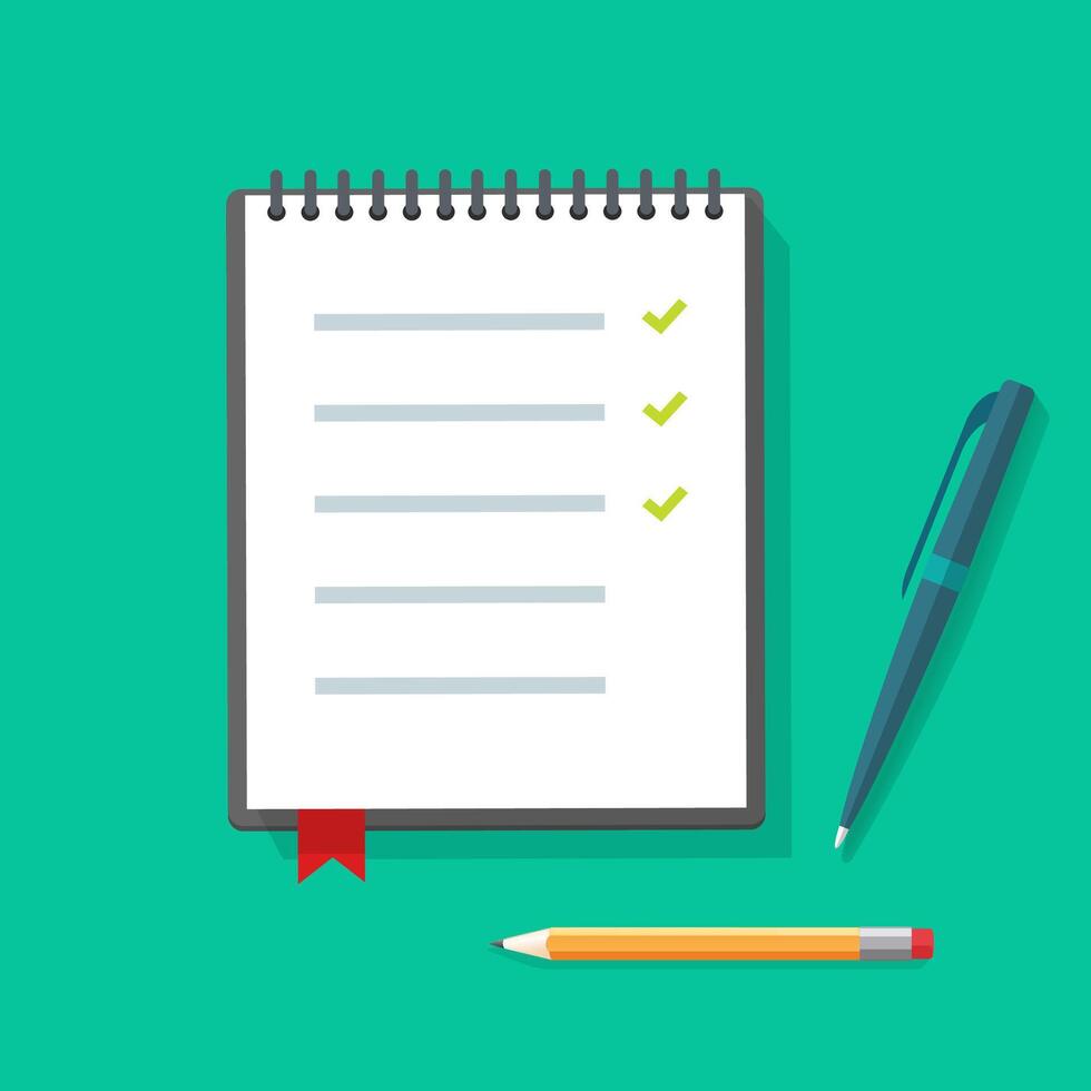 Diary paper notepad or notebook flat illustration with to do check list and pen pencils on table desk, checklist with checkmarks notes on spiral sheet page Pro Vector