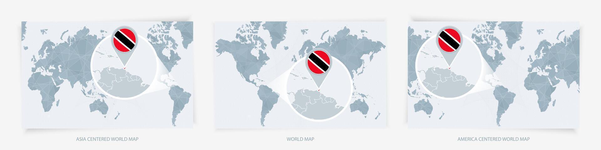 Three versions of the World Map with the enlarged map of Trinidad and Tobago with flag. Pro Vector