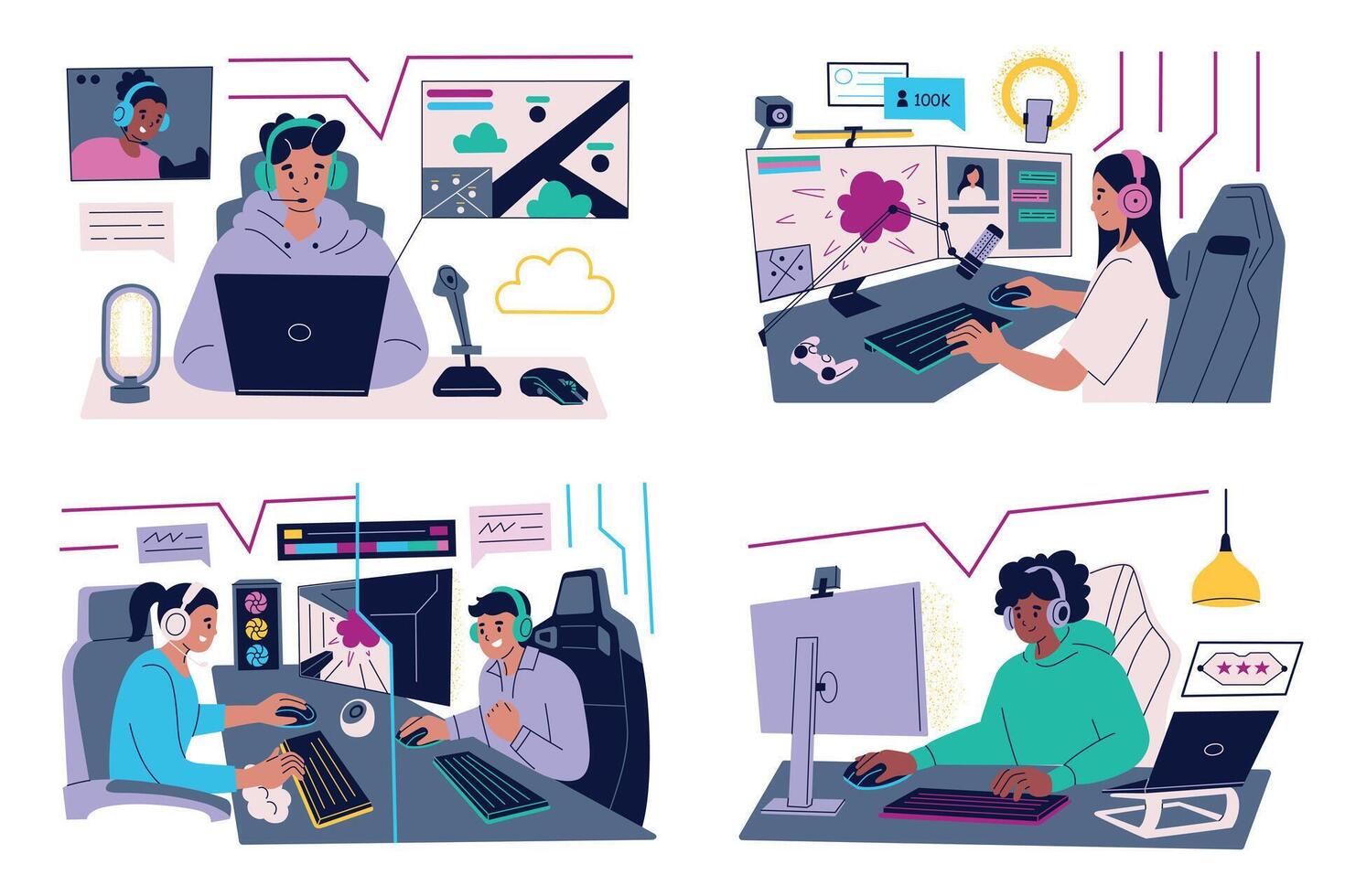 illustration set of gamers streaming, communicating, and playing online games. Modern gaming setups with headsets, screens, and microphones, flat cartoon characters with computers and laptops Pro Vector