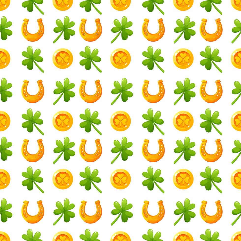 Seamless pattern of gold coins with the image of a shamrock, clover and a golden horseshoe. A repeating pattern depicting gold coins, clover, and horseshoe shamrocks in honor of St. Patrick's Day. Pro Vector