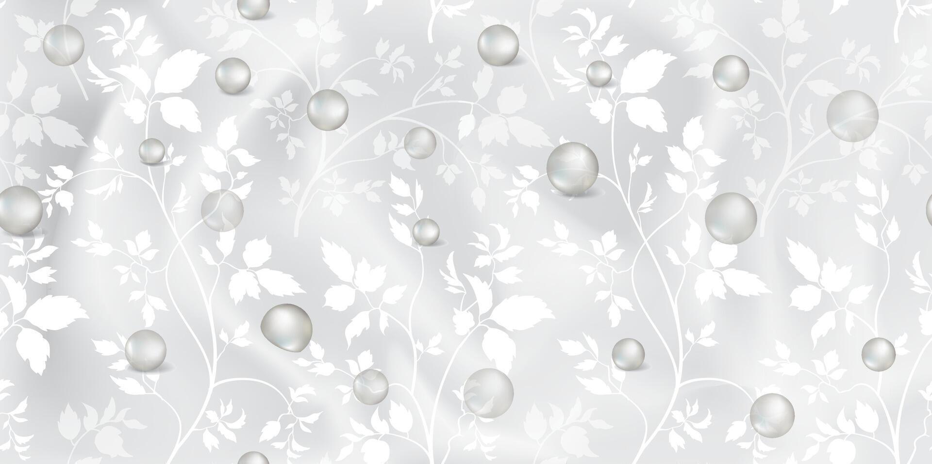 Realistic texture of grey silk background with pattern of leaves and branches. 3D texture of silk natural fabric with smooth pleats and pearl beads Pro Vector