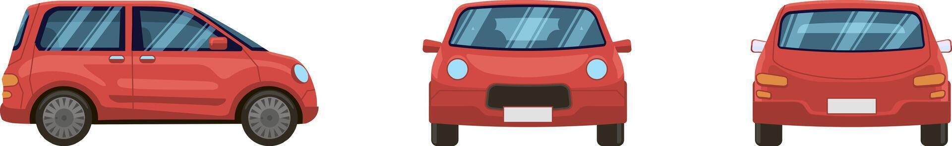 Generic red compact car presented in three different views, front, side and rear, useful for various projects related to transportation and automotive industry Pro Vector