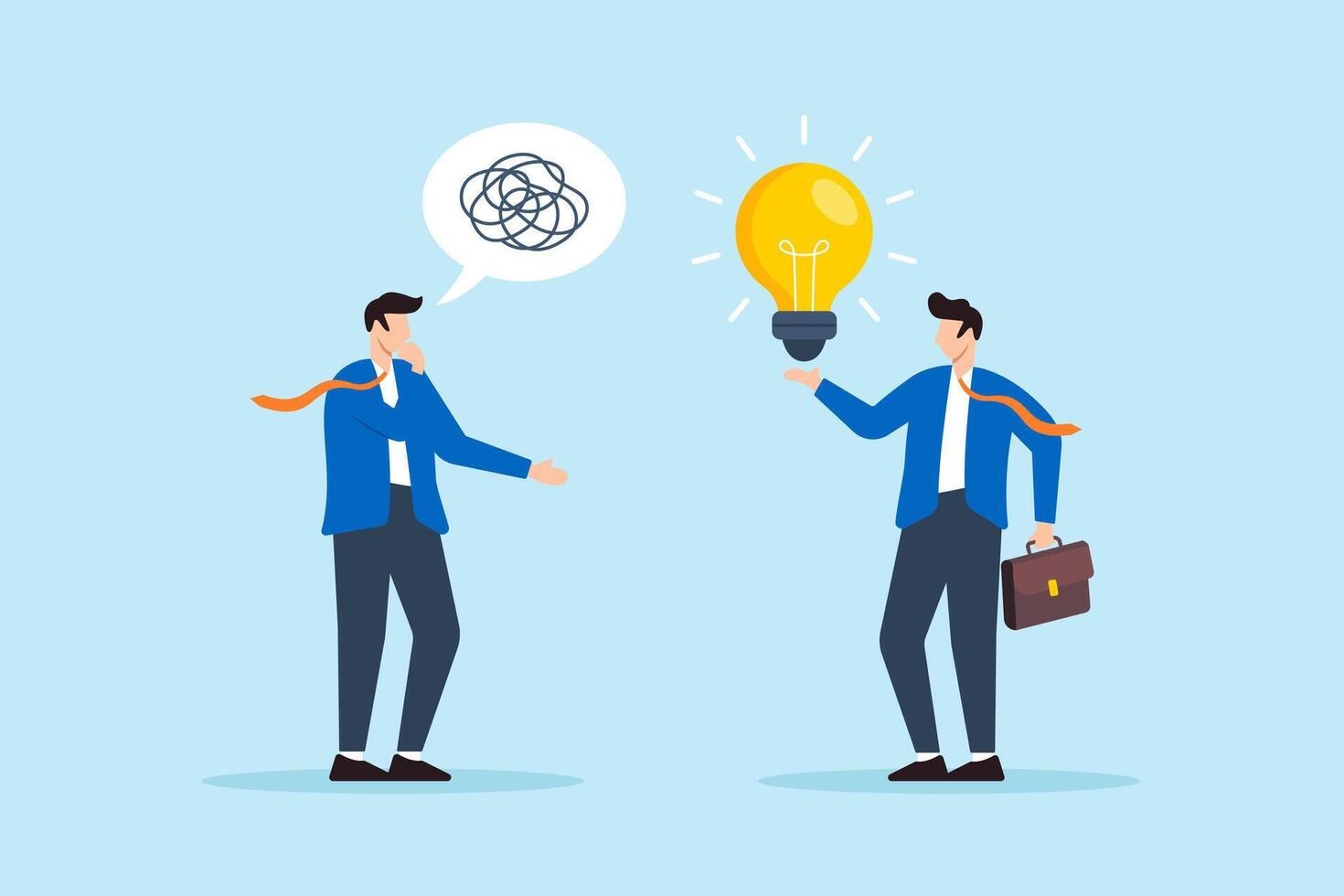 Flat illustration of confused businessman with messy thought receive lightbulb solution from colleague solving problem Pro Vector