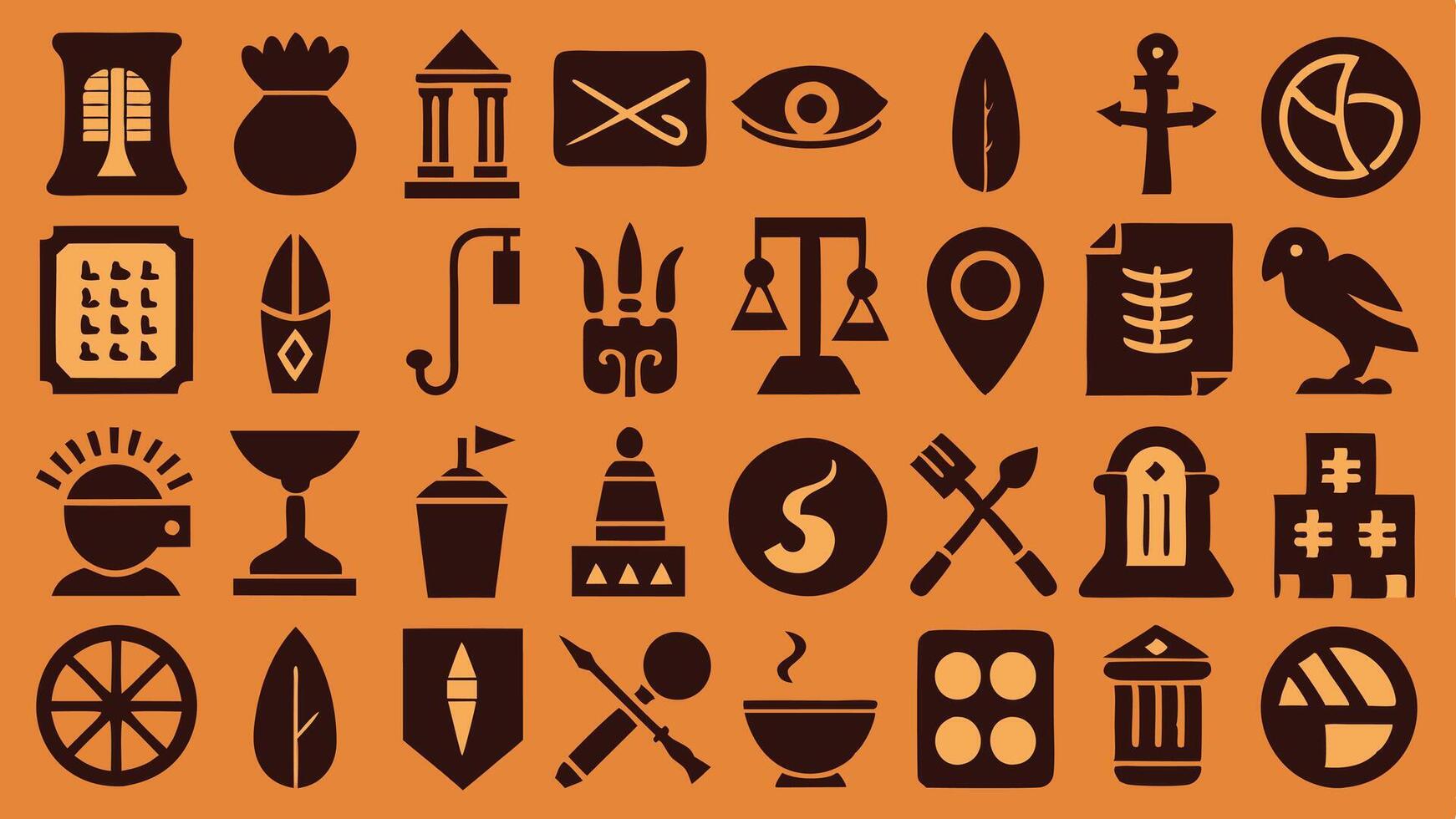 Flat icons featuring ancient writing elements, including hieroglyphs, scrolls, quills, and runestones Pro Vector