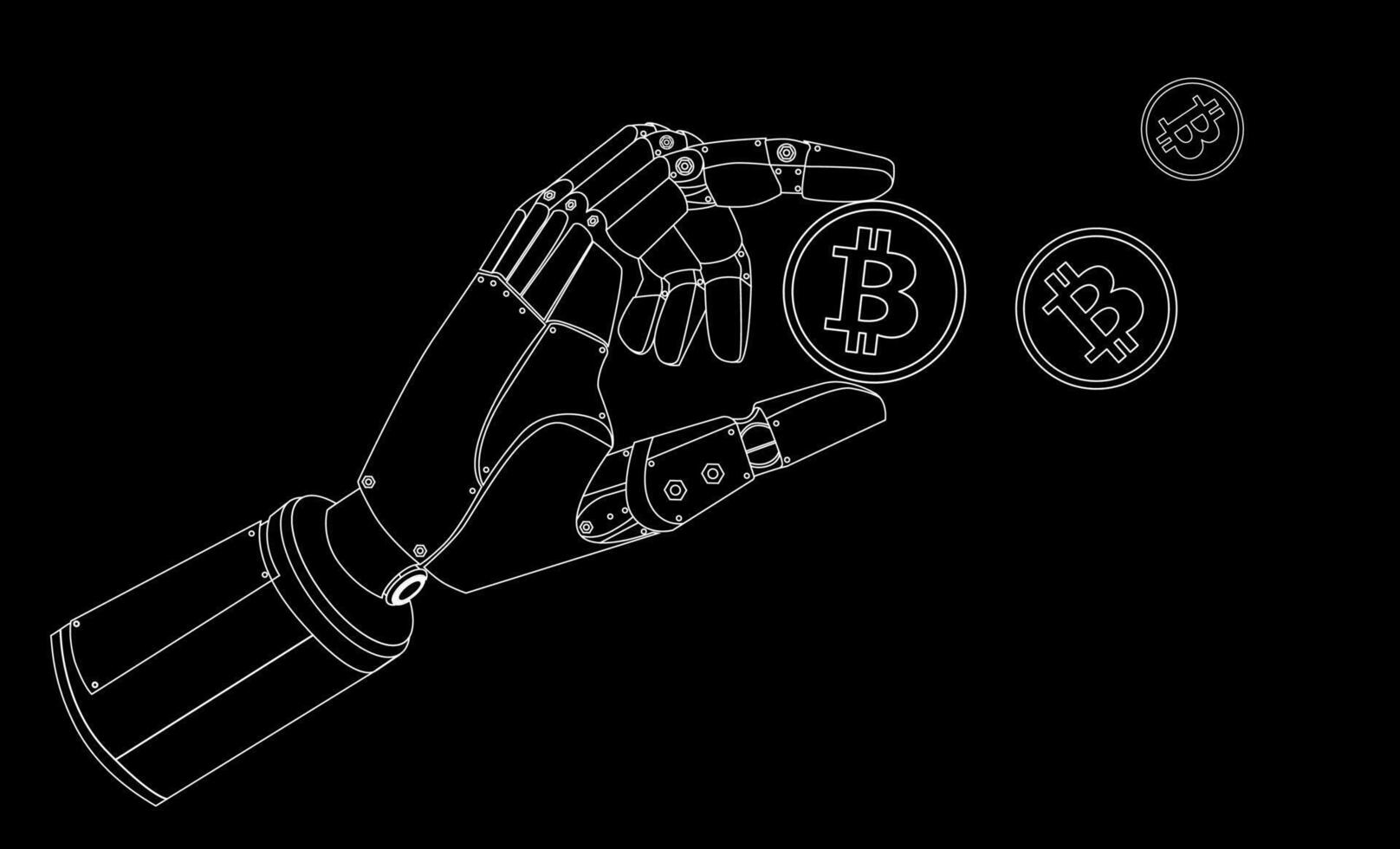 Robotic bionic hand with cryptocurrency coins Line art banner design. Cryptocurrency and blockchain technology concept. AI robot hand holding bitcoin with financial chart. illustration Pro Vector