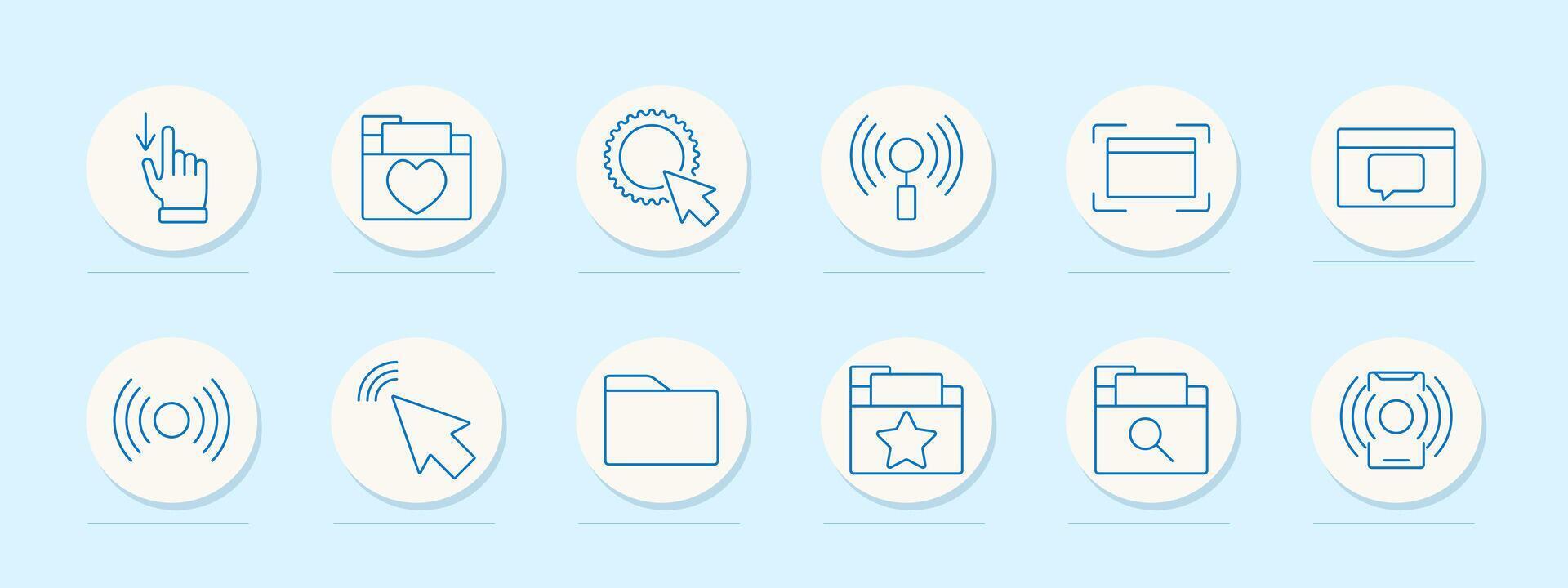 Web set icon. Hand click, favorite folder, cursor on settings, wireless signal, notification, chat, search, star folder, link Pro Vector