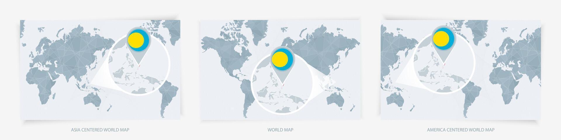 Three versions of the World Map with the enlarged map of Palau with flag. Pro Vector