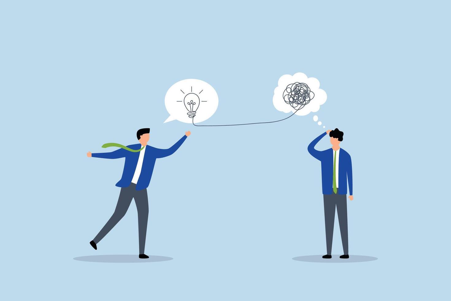 Problem solving skill to think of solution, perplexed entrepreneur with disorganized thoughts while others provide brilliant solutions. Pro Vector