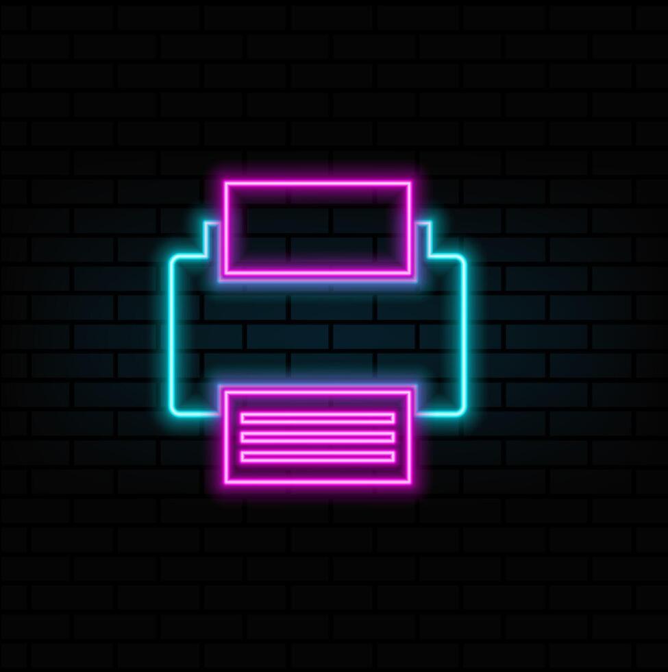 Neon icon of the printer. Elements of the technology set. Simple icon for websites, web design, mobile app, information graphics isolated on brick wall Pro Vector