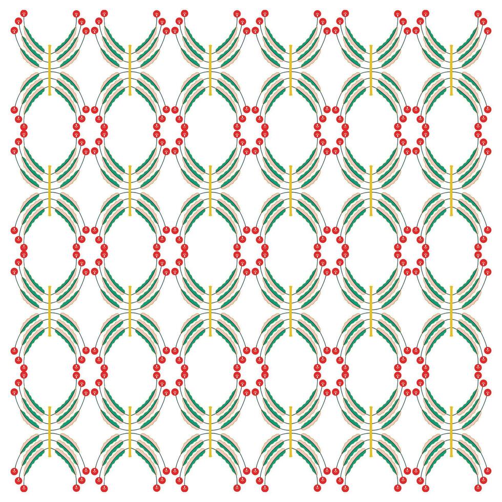 Square print pattern with stylized green and red laurel wreaths linked by yellow ribbons. Pro Vector