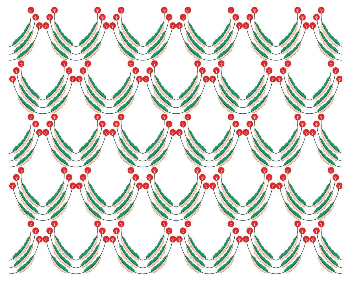 Pattern of green, white, and red arcs with red dots forming a beaded curtain-like design on a white background. Pro Vector