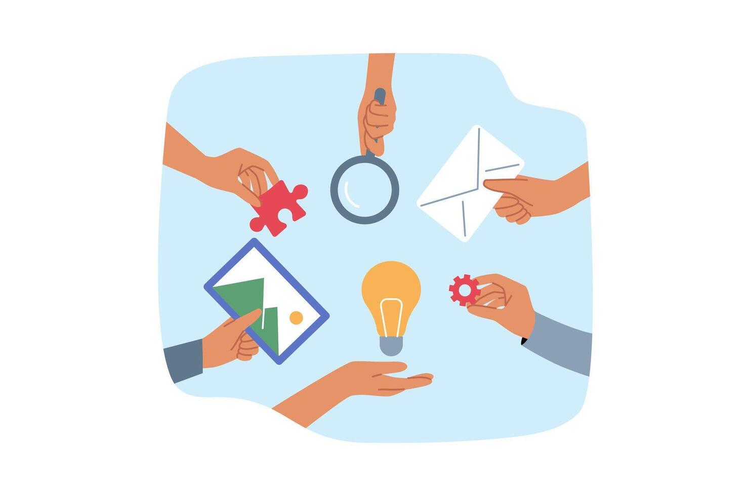Students hands demonstrate teamwork, different tools for team brainstorming and finding solution Pro Vector
