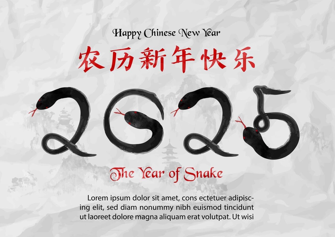 Chinese New Year greeting card with snake in Chinese brush style on white paper pattern background. Chinese letters is meaning Happy Chinese new year and year of the snake in English. Pro Vector