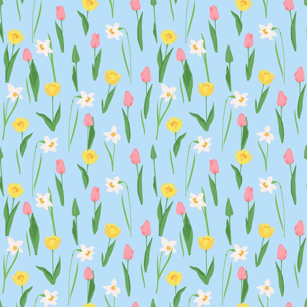Beautiful seamless floral pattern with spring flowers tulips and daffodils. Endless pattern can be used for fabric, wallpaper, pattern fills, web page background, surface textures. Pro Vector