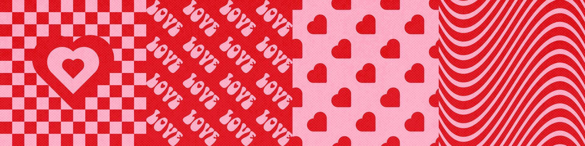 Groovy valentines day dichromatic square backgrounds in retro style set. Greeting card and cover templates collection with geometric patterns. simple flat illustration. Pro Vector