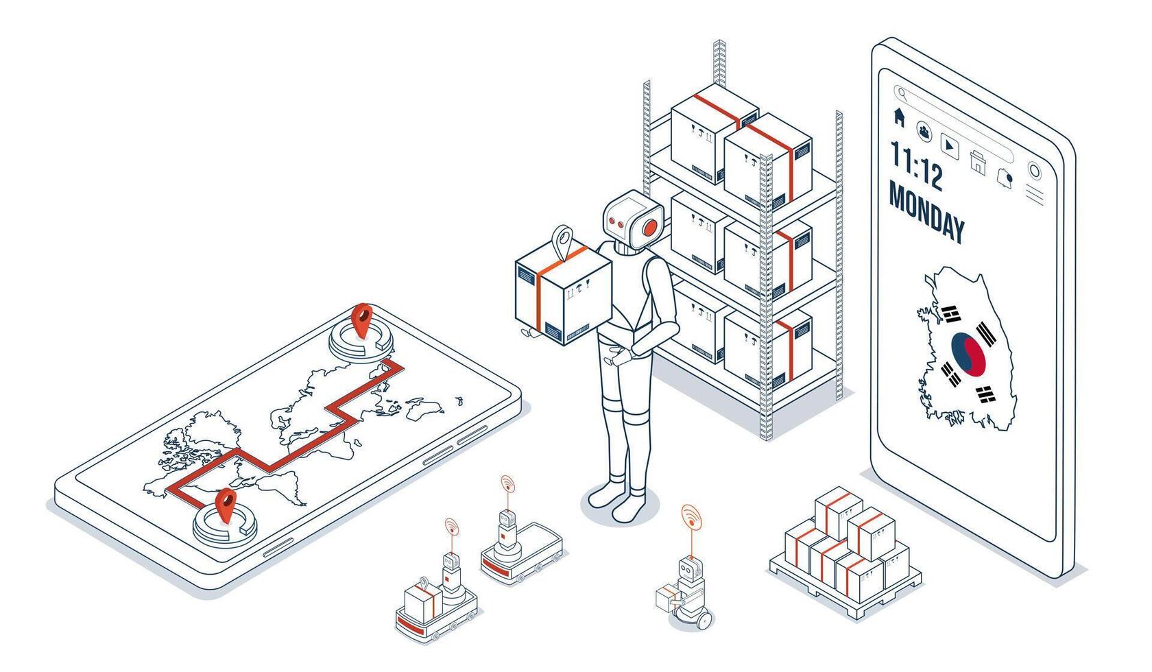 South Korean logistics leverages autonomous robots and AGVs to enable cost-effective, sustainable global operations with efficient digital-physical order fulfillment. Pro Vector
