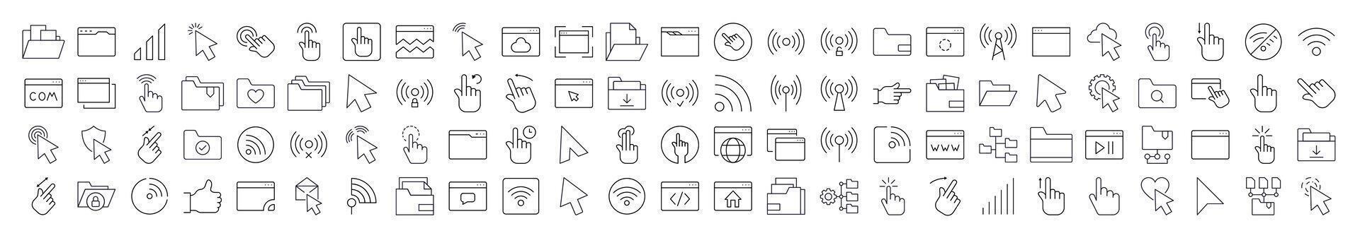 Computer Desktop Line Icon Bundle. Modern Collection for Design, Web Sites, Apps, Cards. Contains Linear Images of Cursor, Wi Fi Waves, Folders, Web Pages Pro Vector