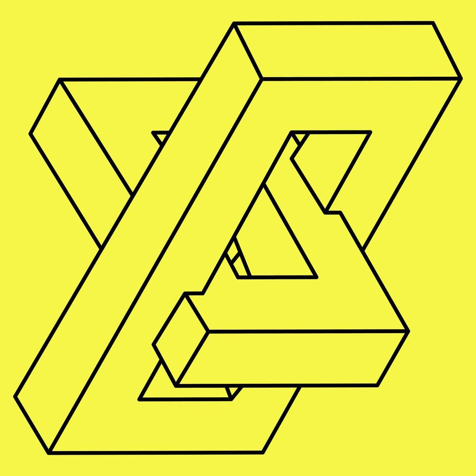 Impossible shapes. Sacred geometry object. Optical illusion shape. Abstract eternal geometric object. Impossible endless outline figure. Optical art. Impossible geometry shape on a yellow background. Pro Vector