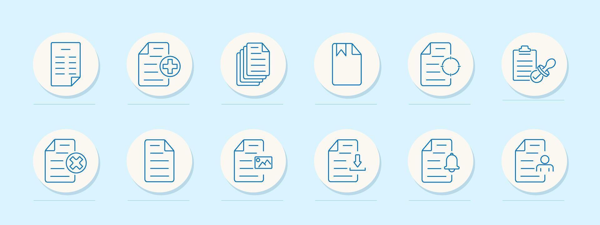 Documents set icon. Paper, medical document, stack of papers, bookmark, clipboard stamp, cancellation, image paper, download, notification, user document. Organization, approvals, record management Pro Vector