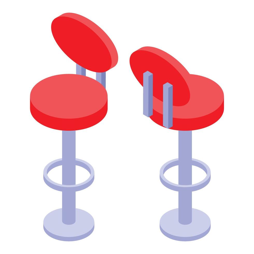 Two red bar stools with backrest and footrest in isometric view Pro Vector