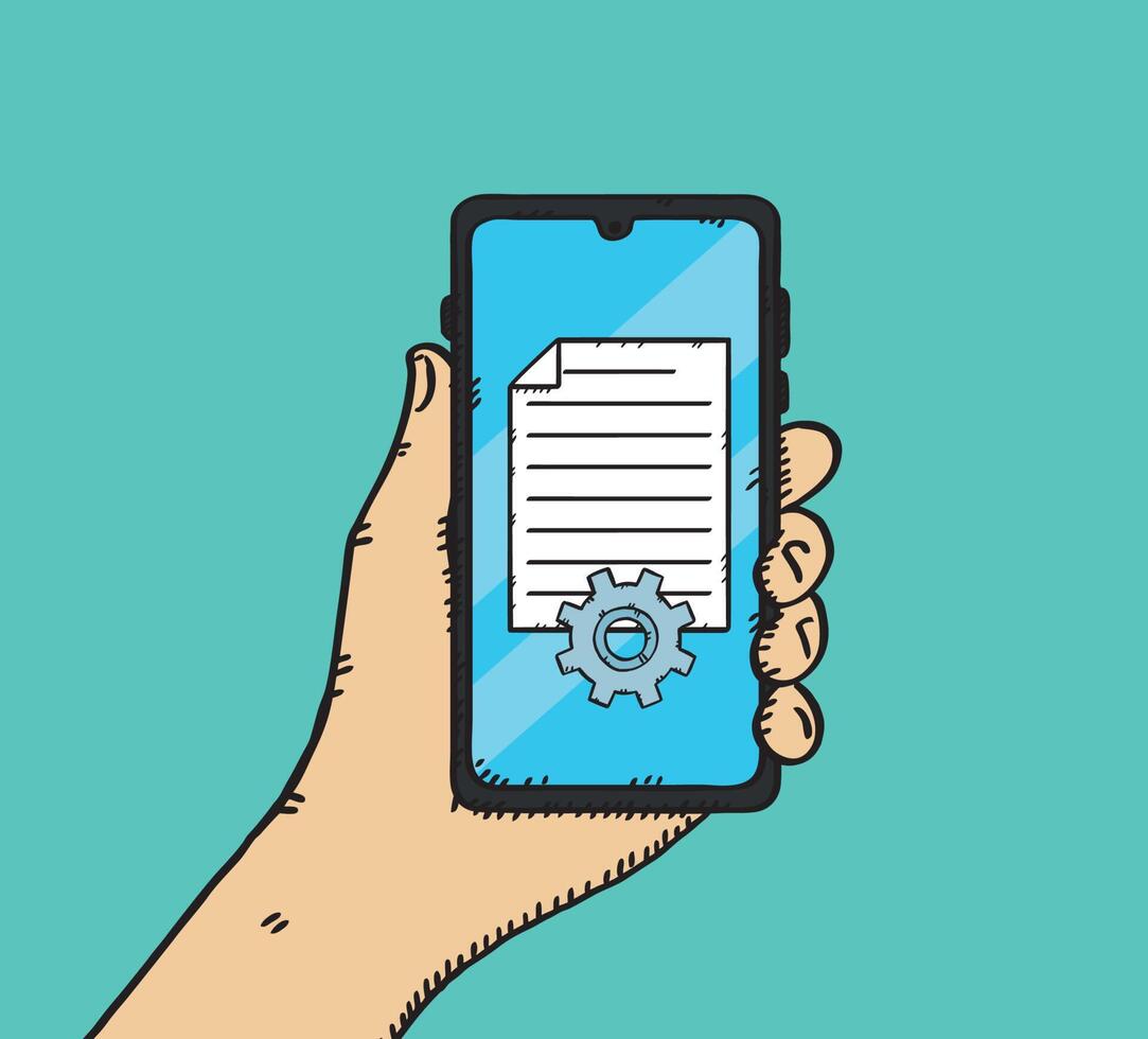Hand holding mobile phone with text document and cog on screen. Sketch style illustration Pro Vector