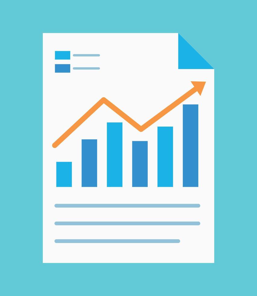Document graphics with line chart and data. The graph is ascending. There is an orange arrow above the graph. Flat design. Pro Vector