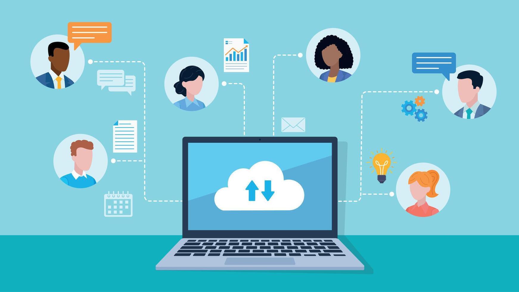 Laptop with a cloud connection icon on the screen. Around the laptop are employee avatars. Next to them are icons of light bulbs, gears, conversation, document, calendar. Flat design. Pro Vector