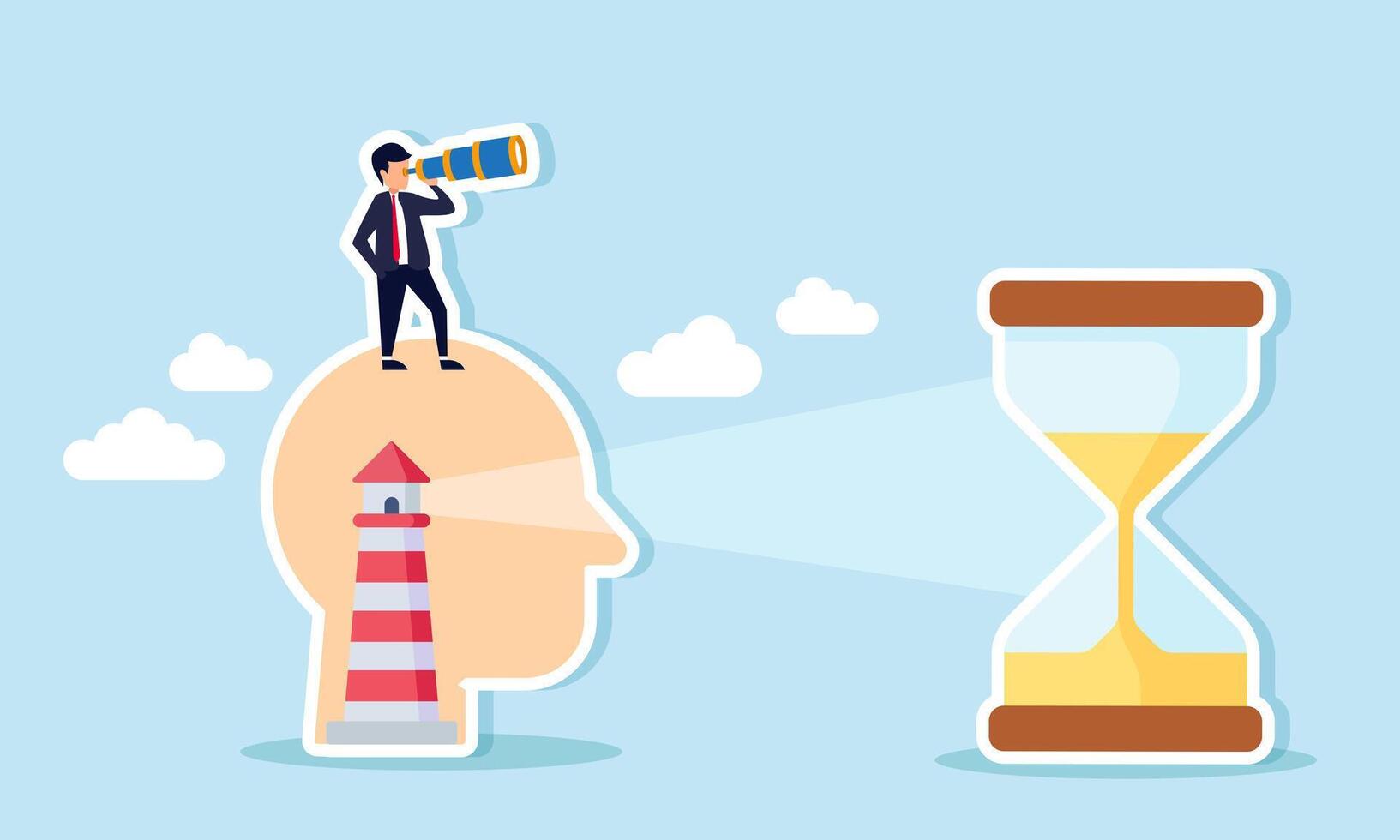 A businessman peering through a telescope from atop a head contain a lighthouse, its light shining on an hourglass ahead, illustration of analyst in perform business tasks efficiently Pro Vector