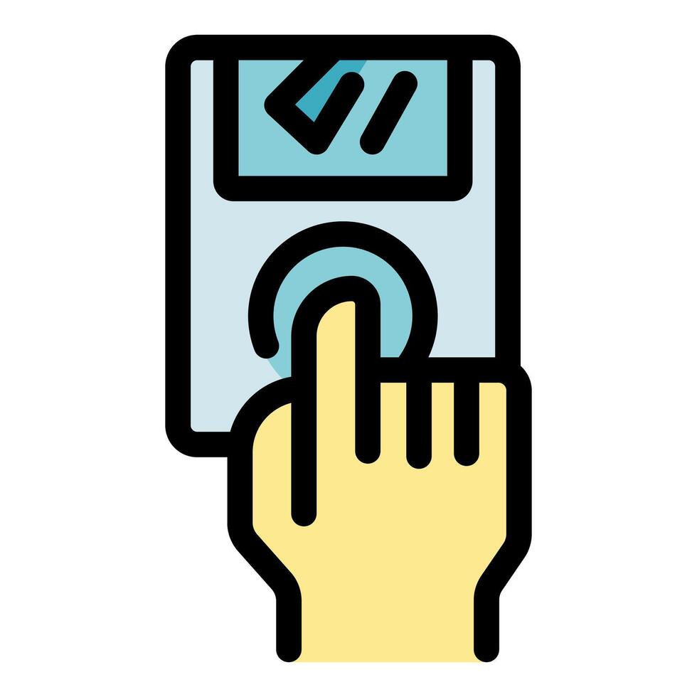 Hand pressing button on electronic device with screen displaying information Pro Vector