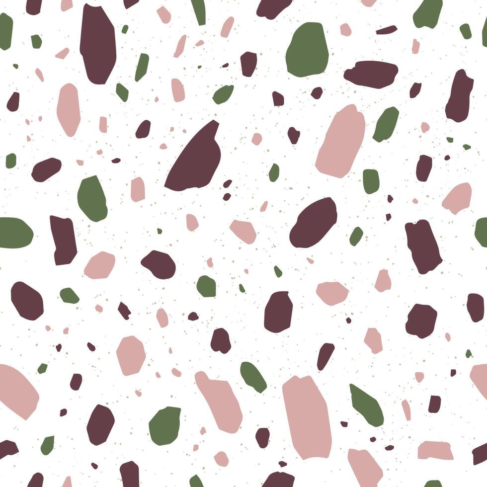 Terrazzo geometric texture or tile. Seamless pattern with pink and green sprinkles scattered on white background. Creative illustration for backdrop, textile print, wrapping paper, flooring. Pro Vector