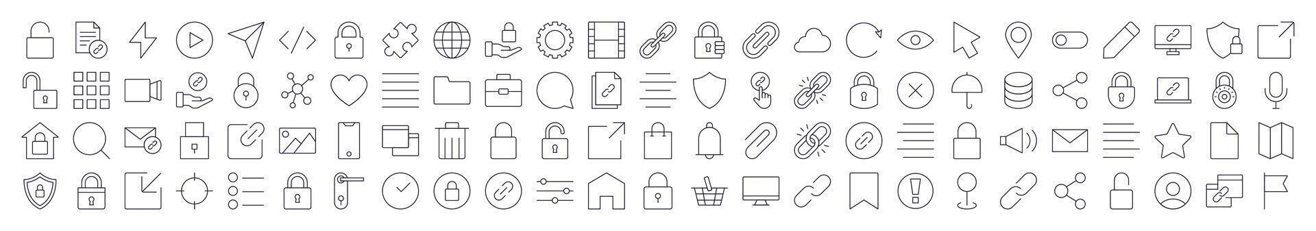 Bundle of Interface of Site Related Line Icons. Editable Stroke for Design, Web Sites, Apps, Cards. Contains Linear Images of Share, Coding, Like, Bookmark, Menu Pro Vector