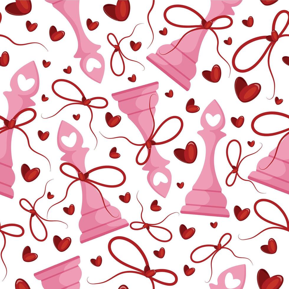 valentines day seamless pattern with chess pieces namely pink elephant with red bow and red hearts, for patterns, textile or packaging Pro Vector