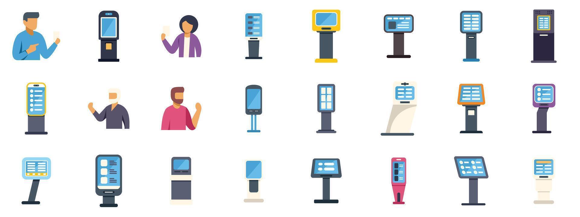 People using interactive terminal kiosk showing information on digital screen Pro Vector