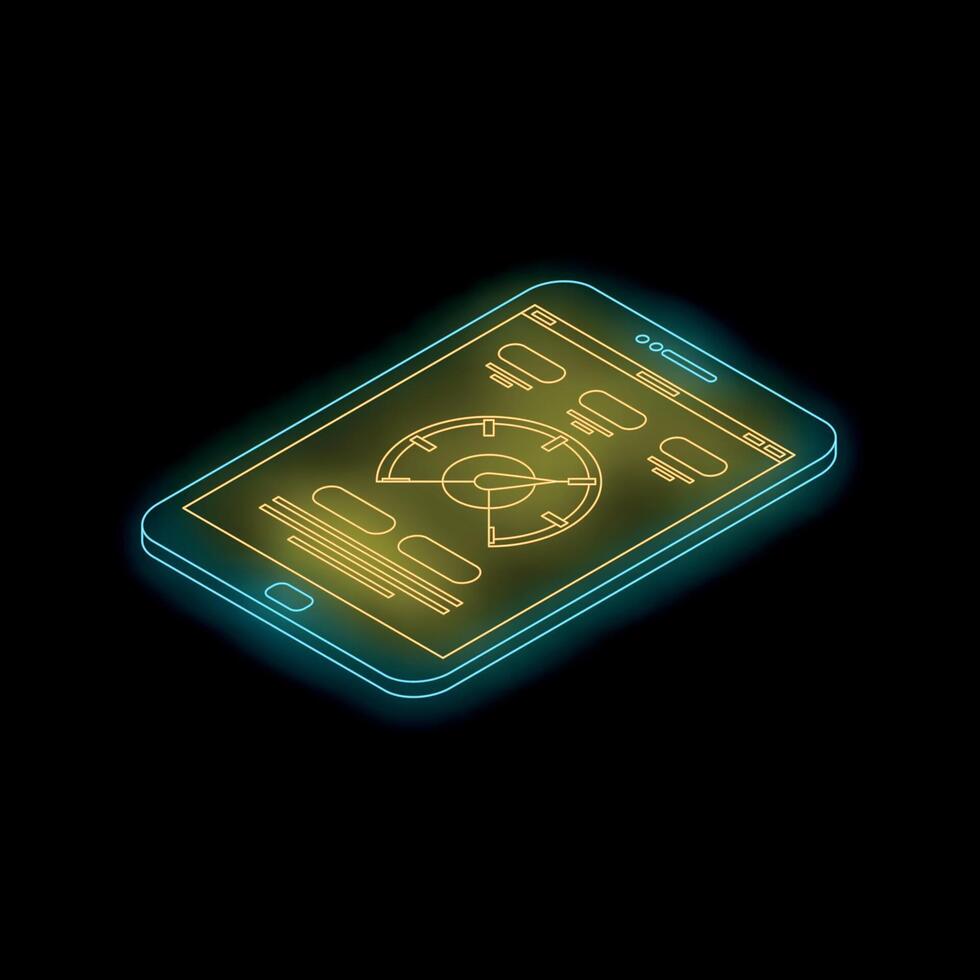 Neon glowing smartphone displaying performance and analytics data on dark background Pro Vector