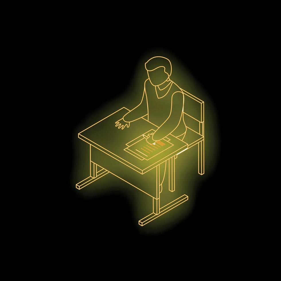 Student studying and writing at desk in isometric view with neon effect Pro Vector