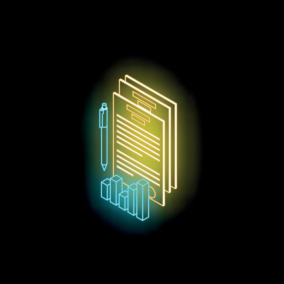 Neon icon of documents with pen and growing bar graph representing business analysis Pro Vector