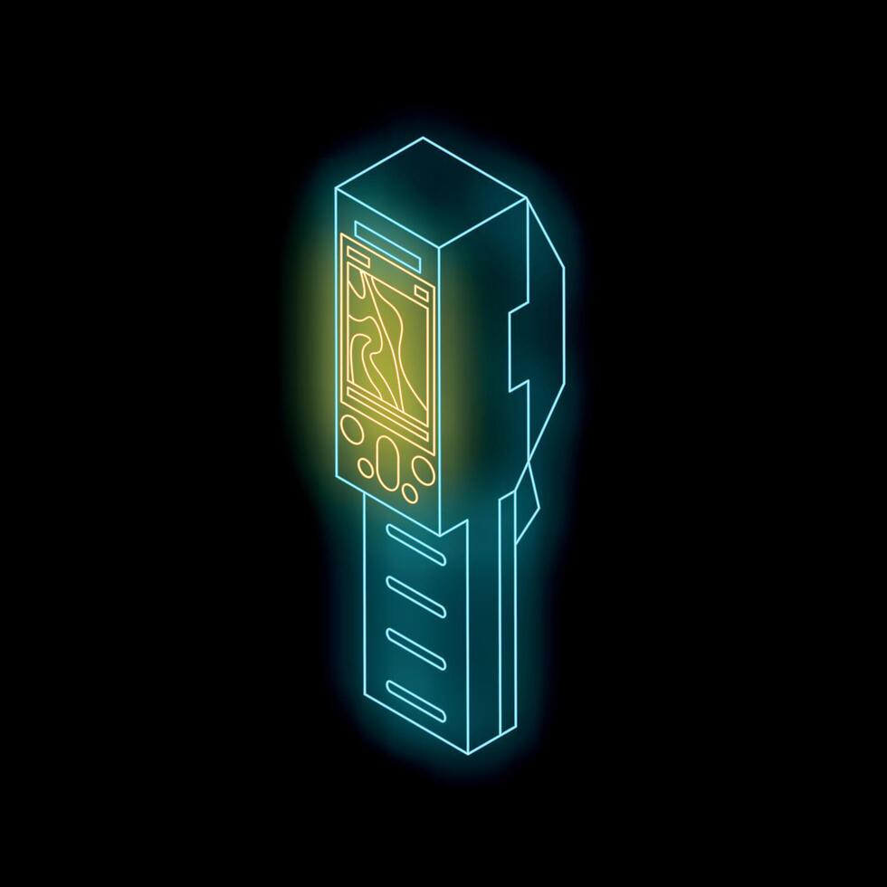 Neon glowing gps navigator device showing map in isometric view Pro Vector