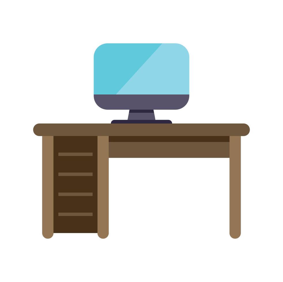 Modern desktop computer sitting on wooden table with drawers Pro Vector