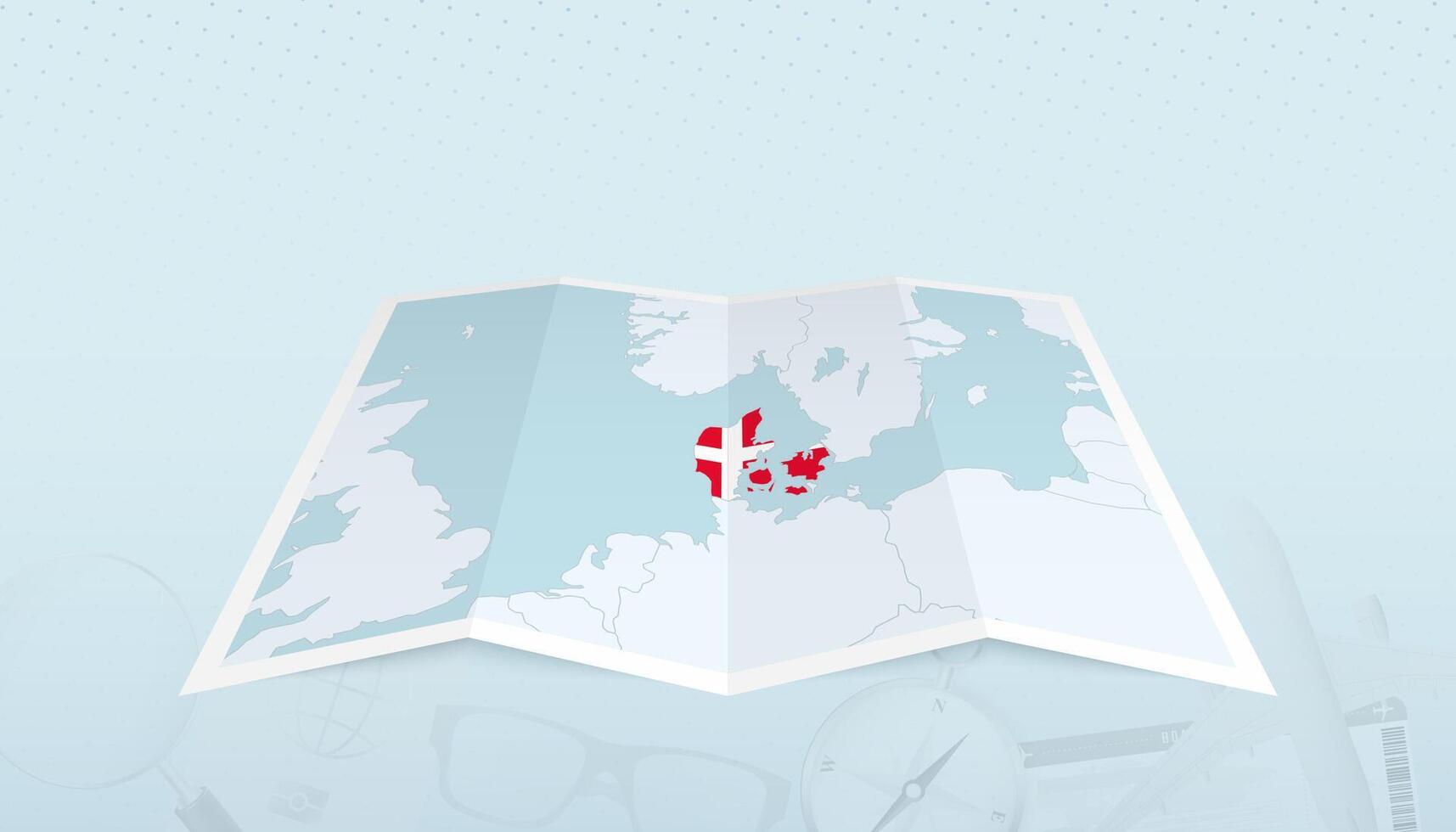 Map of Denmark with the flag of Denmark in the contour of the map on a trip abstract backdrop. Pro Vector