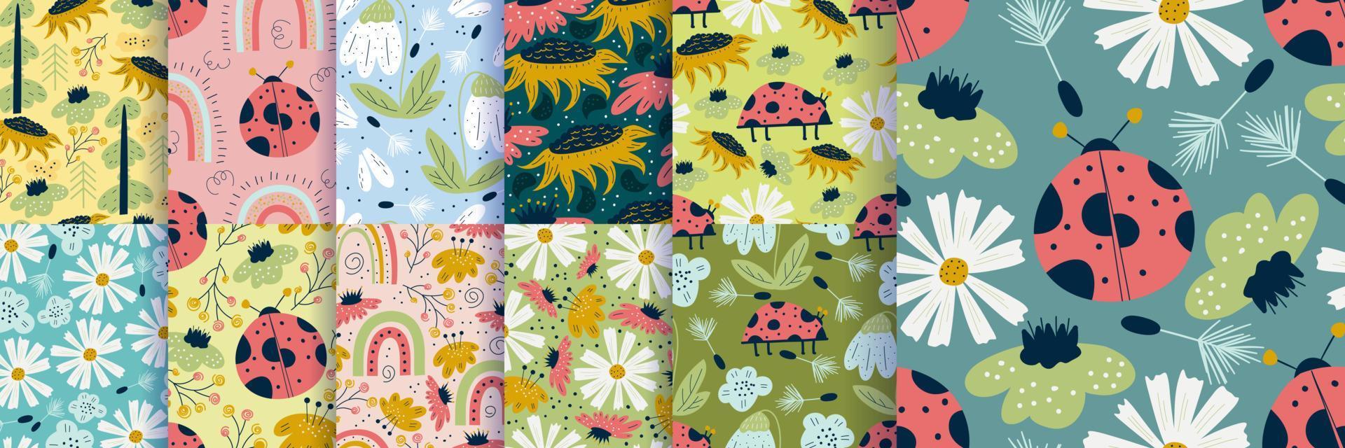 Scandinavian set of spring patterns with sunflowers, ladybugs and snowdrop, daisy. Seamless pattern with insects and flower. Vector illustration design. Summer floral scandinavian nursery print design Pro Vector