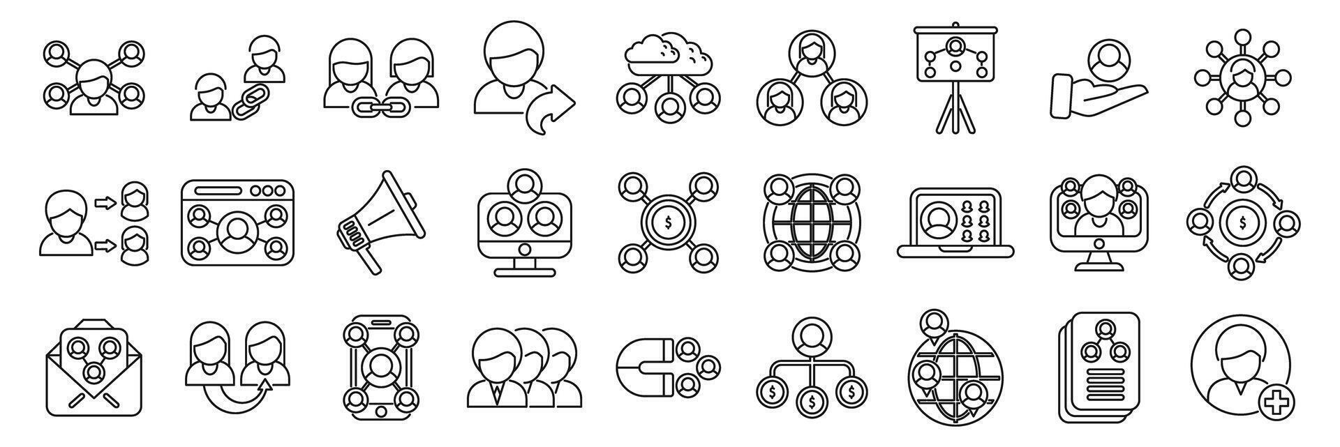 Referral network icons set. Referral program and business networking icons showing refer a friend, affiliate marketing, and global partnership Pro Vector