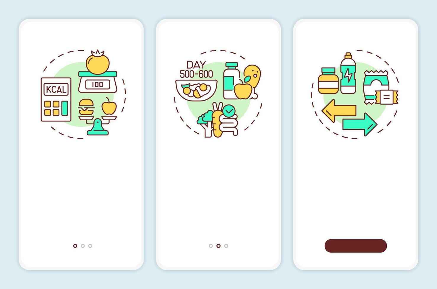Dietary changes onboarding mobile app screen. Healthy food. Walkthrough 3 steps editable graphic instructions with linear concepts. UI, UX, GUI template Pro Vector