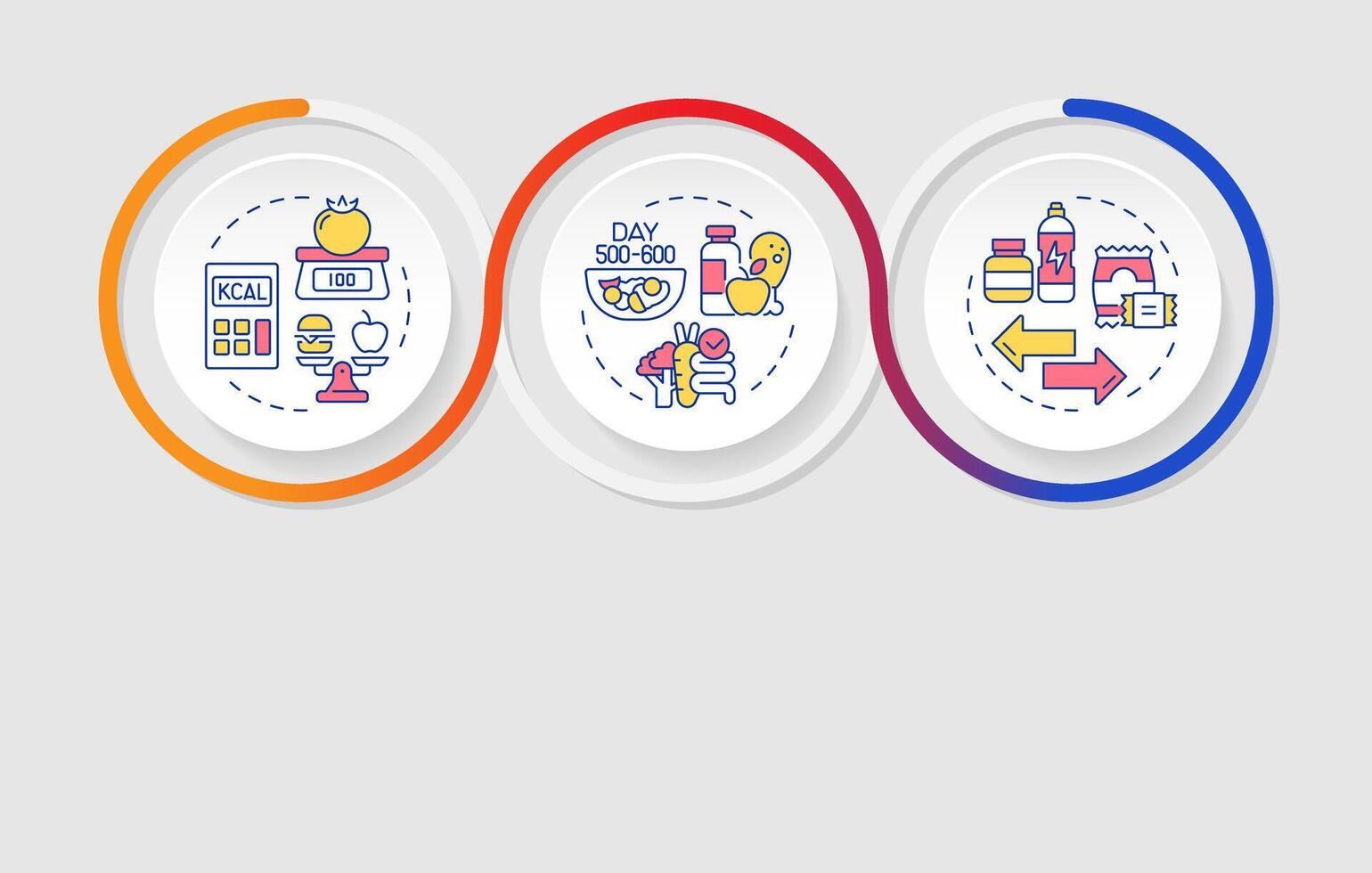 Diet organization infographics circles sequence. Meal replacement, overweight. Visualization layout with 3 steps. Info chart loop process presentation Pro Vector