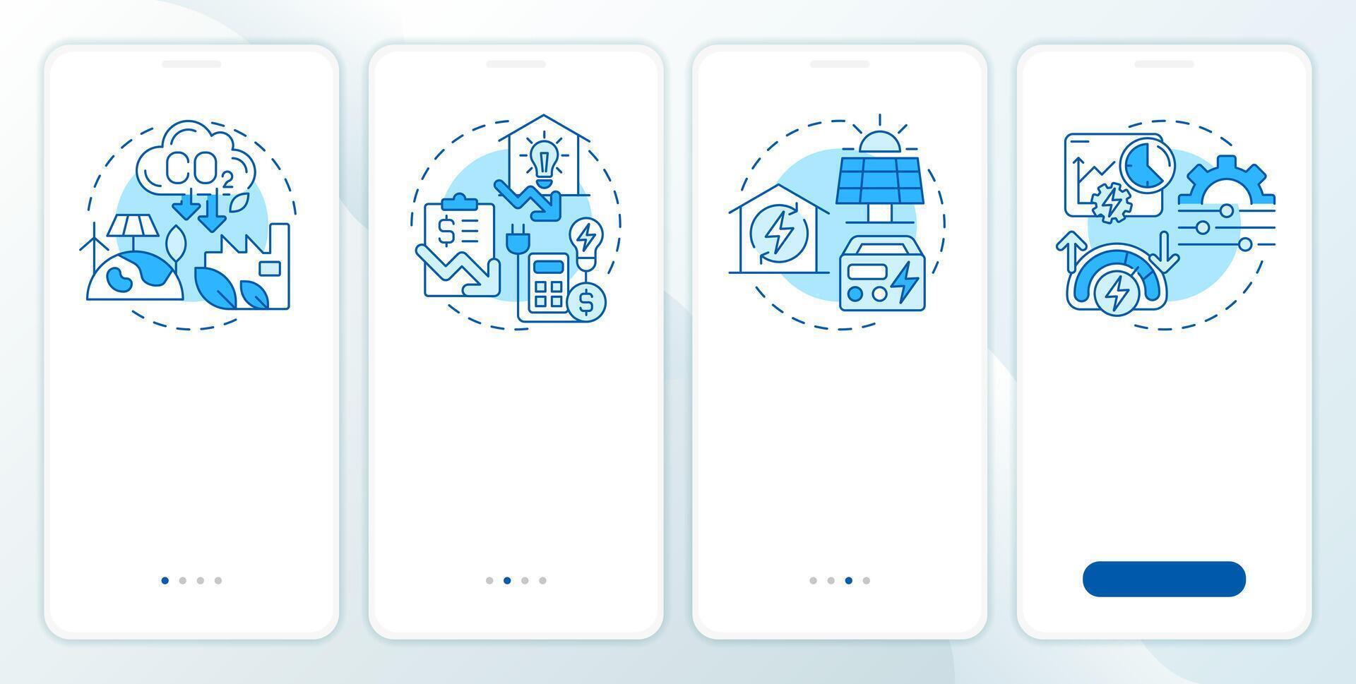 Energy control benefits blue onboarding mobile app screen. Walkthrough 4 steps editable graphic instructions with linear concepts. UI, UX, GUI template Pro Vector
