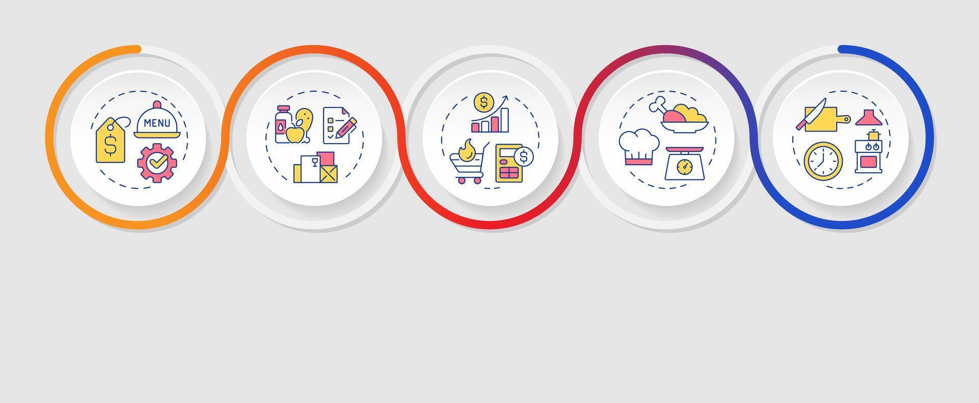 Restaurant management infographics circles sequence. Menu engineering in catering business. Visualization layout with 5 steps. Info chart loop process presentation Pro Vector