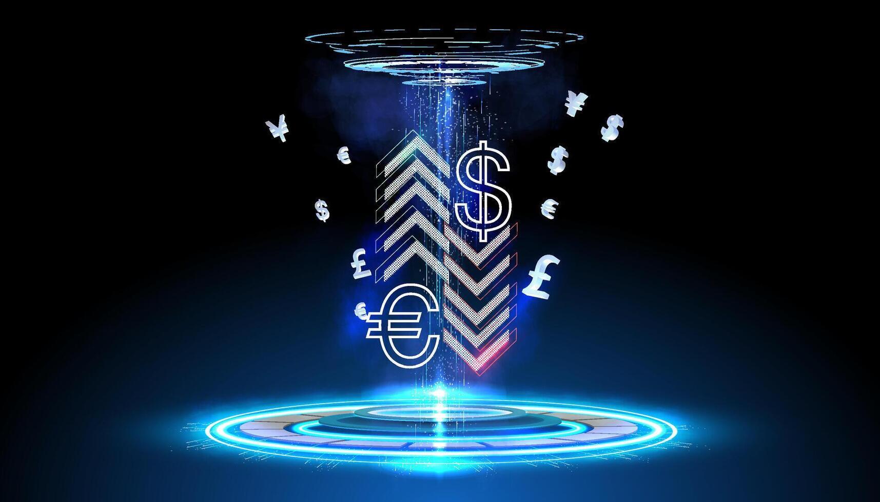 Modern digital currency exchange with floating currency symbols in a futuristic design illuminated by bright blue lights Pro Vector