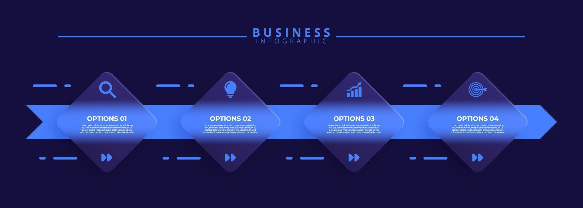 Infographic label design template featuring icons and four distinct steps. Ideal for process charts, presentation slides, workflow schemes Pro Vector