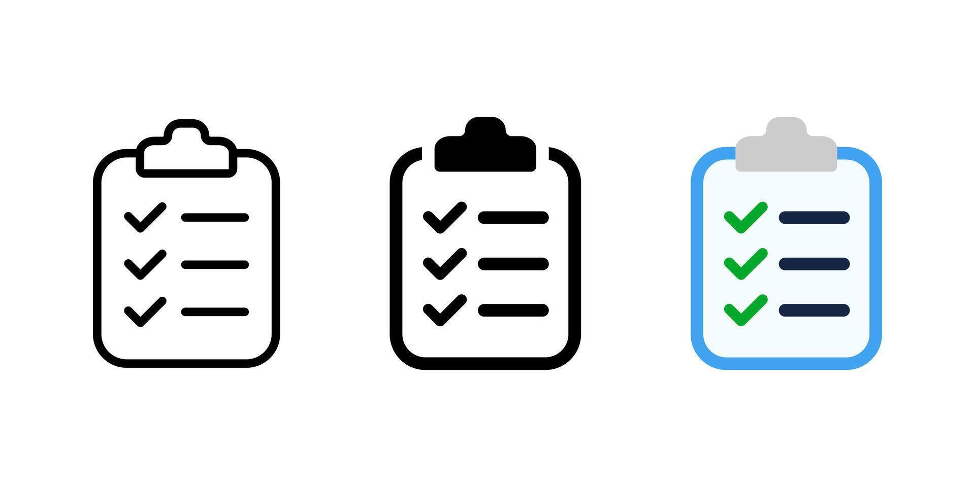 Checklist clipboard icon. Clipboard illustration. Checkup plan on the board symbol. Paper document with check marks and fields sign. Schedule note. Report pictogram. Test and exam workbook glyph Pro Vector