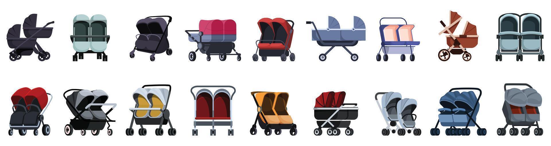 Double pram icons set. Double stroller representing different models for twins on white background Pro Vector